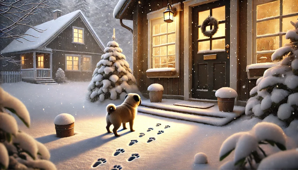 Mit gespitzten Ohren stand er an der Tür und schnüffelte aufgeregt. „Was ist denn, Coco?“, fragte Lina, doch der kleine Mops war schon mit tapsigen Schritten zur Tür unterwegs. Lina öffnete ihm neugierig die Tür, und sofort stürmte Coco nach draußen in den Schnee. Seine Pfoten hinterließen winzige Abdrücke, aber es waren andere Spuren, die ihn interessierten.