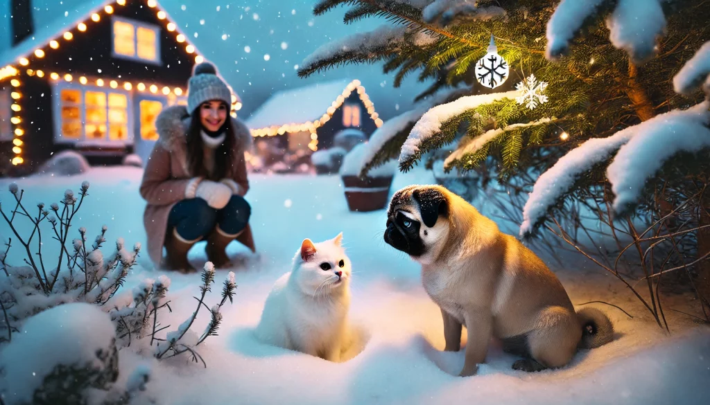 Coco bellte zustimmend, als wolle er sagen: „Dann bleibt sie eben bei uns!“ Die Katze schnurrte so laut, dass es selbst über das leise Knirschen des Schnees zu hören war. Lina stand auf und klopfte den Schnee von ihren Knien. „Komm, wir bringen sie rein. Es ist kalt hier draußen.“ Sie hob die Katze vorsichtig hoch, und Coco lief stolz neben ihr her, als hätte er einen neuen Schatz entdeckt.